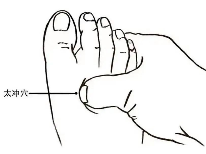 太冲穴:脚背第一、二趾骨结合部前方凹陷处。按压3-5分钟,可缓解肝郁气滞。