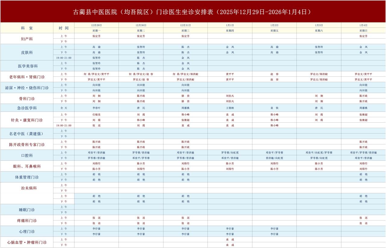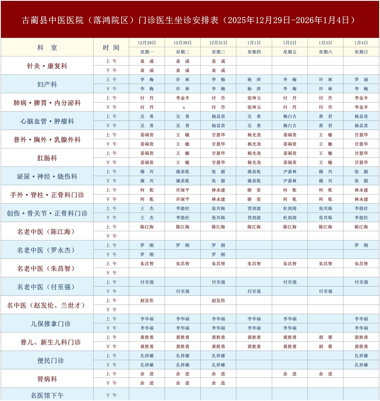 为满足广大患者的就诊需求,为群众提供便捷优质服务。古蔺县中医医院将下周均吾院区、落鸿院区门诊医师坐诊时间安排整理如下,敬请根据需要查询!