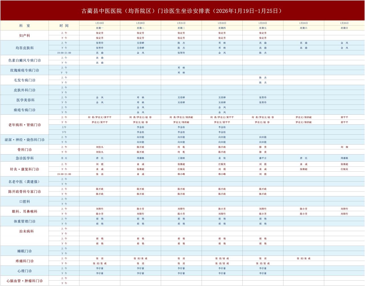 1月19日-1月25日古蔺县中医医院新老院区门诊医生排班表