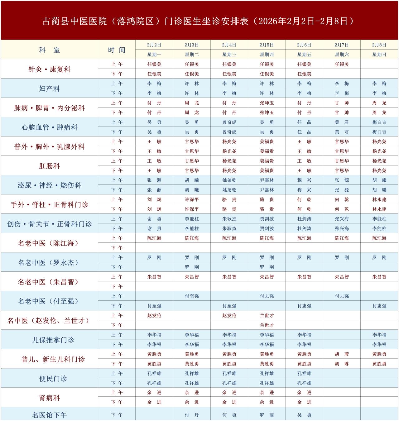 2月2日-2月8日古蔺县中医医院新老院区门诊医生排班表