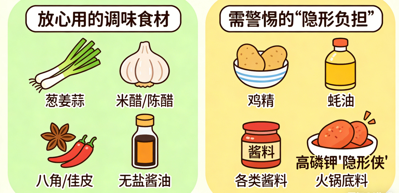 × 需警惕的“隐形负担”:鸡精、蚝油、各类酱料、火锅底料(高磷钾“隐形侠”)。