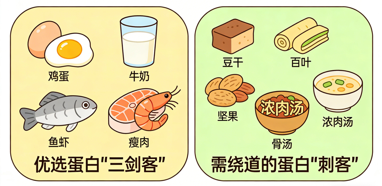 √ 优选蛋白“三剑客”:鸡蛋、牛奶、瘦肉/鱼虾。每天总量约2两,掌心大小的分量,既能补充营养,又不会给肾脏增加负担。