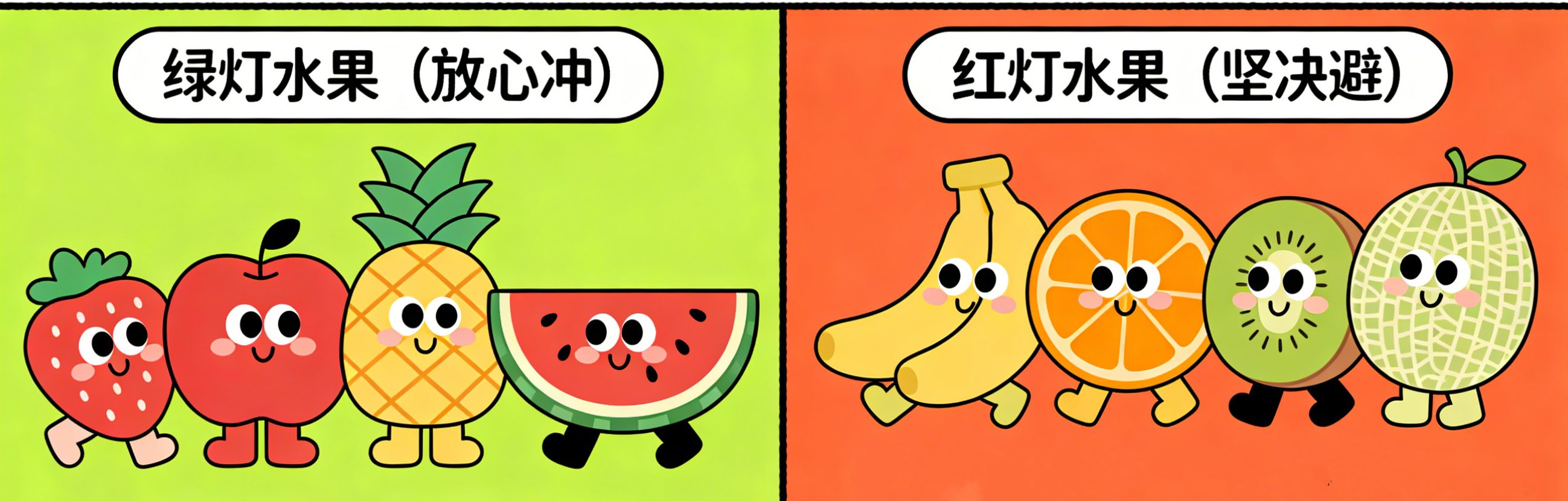 √ 绿灯水果(放心冲):草莓、苹果、菠萝、西瓜(务必小份食用,一次不超过100g)。