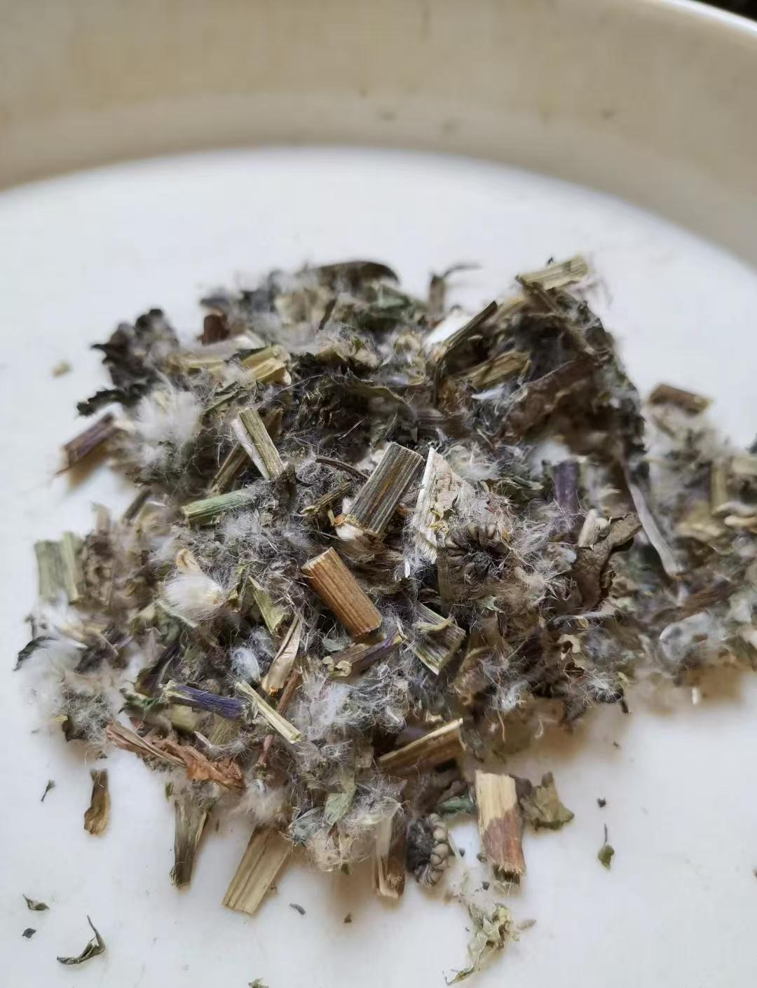 【性 状】本品茎呈圆柱形,基部直径可达1.2cm;表面绿褐色或棕褐色,有数条纵棱,被丝状毛;断面灰白色,髓部疏松或中空。叶皱缩,多破碎,完整叶片展平后呈倒披针形或倒卵状椭圆形,羽状深裂,边缘具不等长的针刺;上表面灰绿色或黄棕色,下表面色较浅,两面均具灰白色丝状毛。头状花序顶生,球形或椭圆形,总苞黄褐色,羽状冠毛灰白色。气微,味淡。