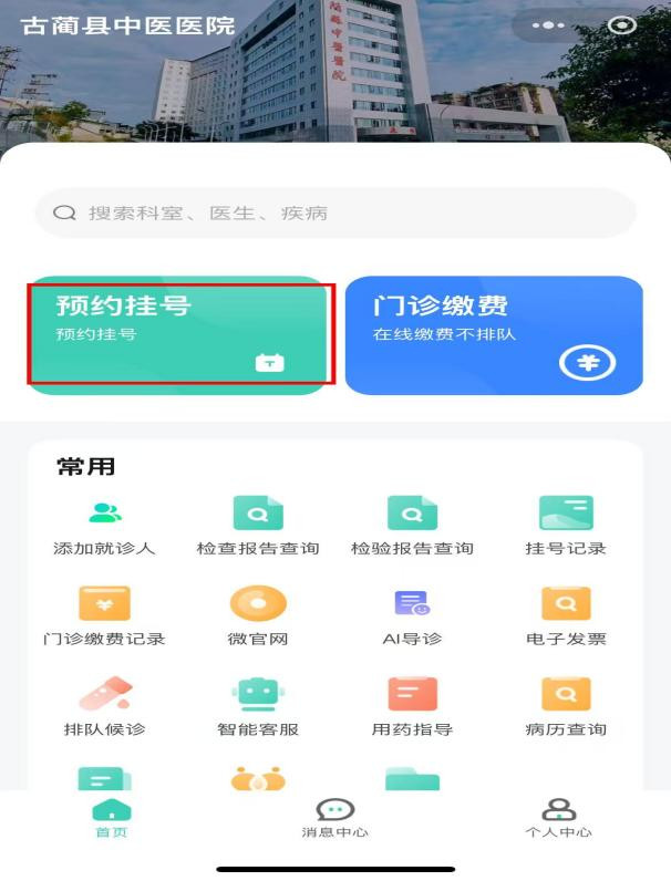 1、进入古蔺县中医医院公众号或小程序,点击预约挂号。