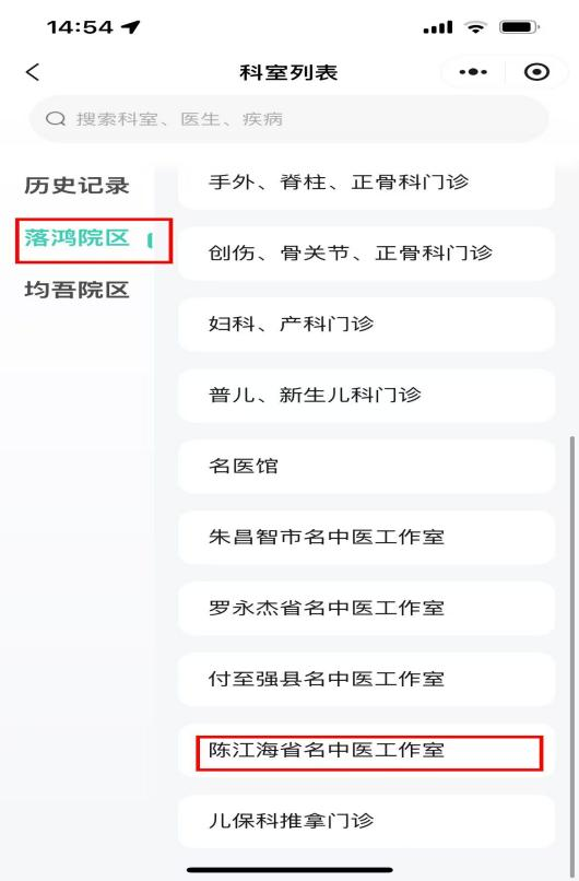2、选择落鸿院区,陈江海名医工作室。