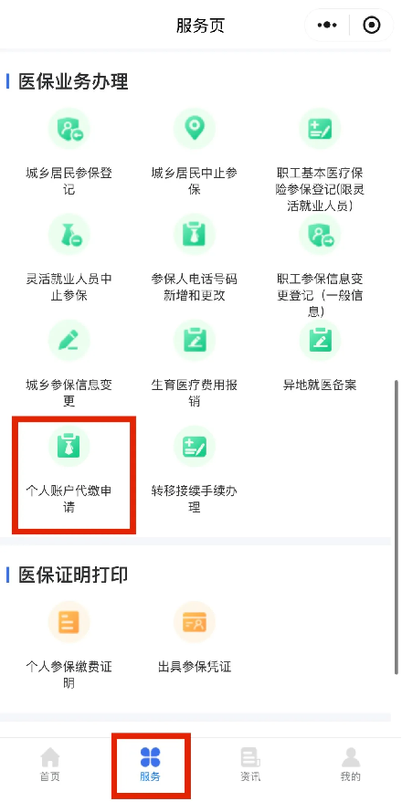 (一)在主界面点击底部服务按钮,进入服务列表界面,再点击“个人账户代缴申请”。