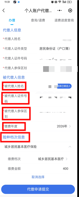 (二)确认代缴人与被代缴人信息,选择缴费区划与缴费年限,进行信息校验。