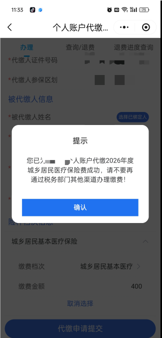 (四)弹出缴费成功提示,点击确认,完成办理。