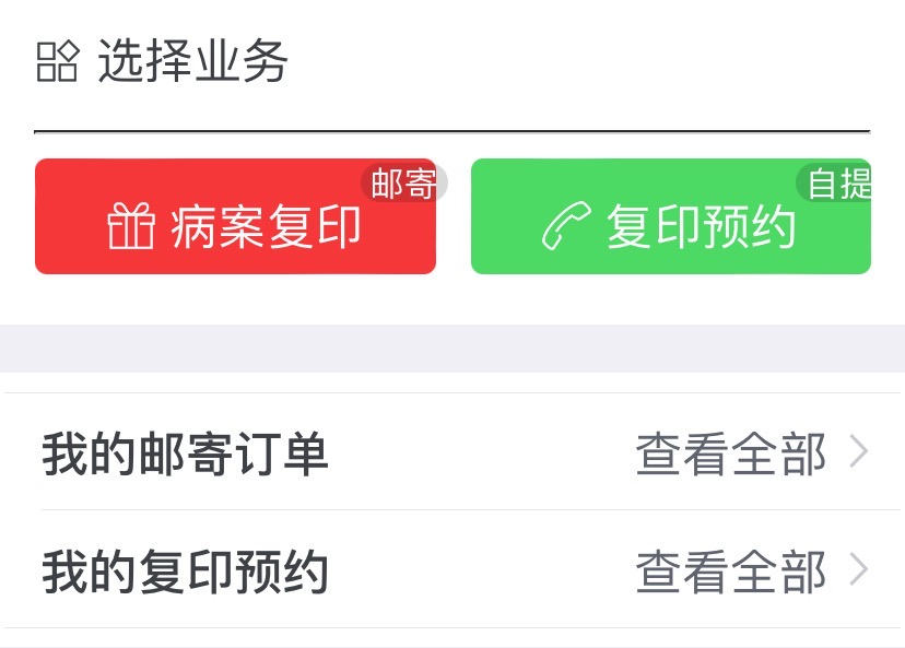 (二)选择业务:点击红色“病案复印”(邮寄)按钮,若需先预约再自提,可选择绿色“复印预约”(自提)。
