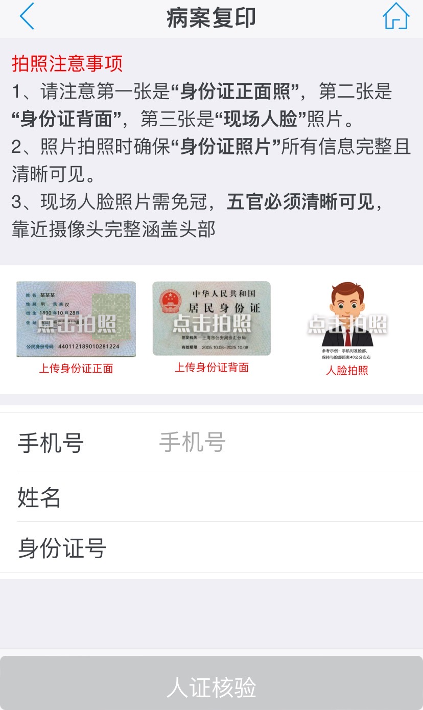 1.确认所有信息及照片无误后,点击“人证核验”按钮,等待系统审核通过,审核通过后进入下一步病历复印申请及邮寄。