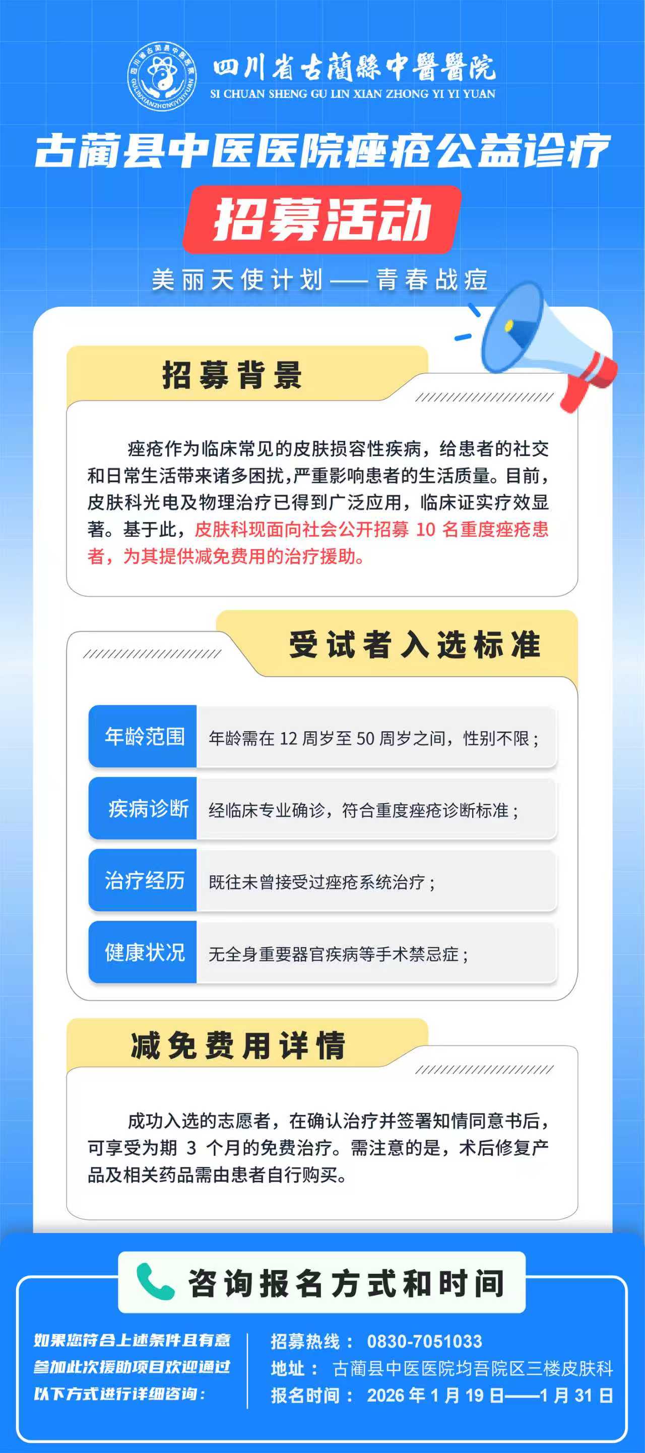 古蔺县中医医院现开设皮肤科痤疮专病门诊,以患者需求为导向,整合优势,为痤疮患者提供个体化、规范化治疗,以达到治疗、美观、预防于一体的目的。让古蔺及周边地区的患者足不出县,就能实现青春战“痘”!