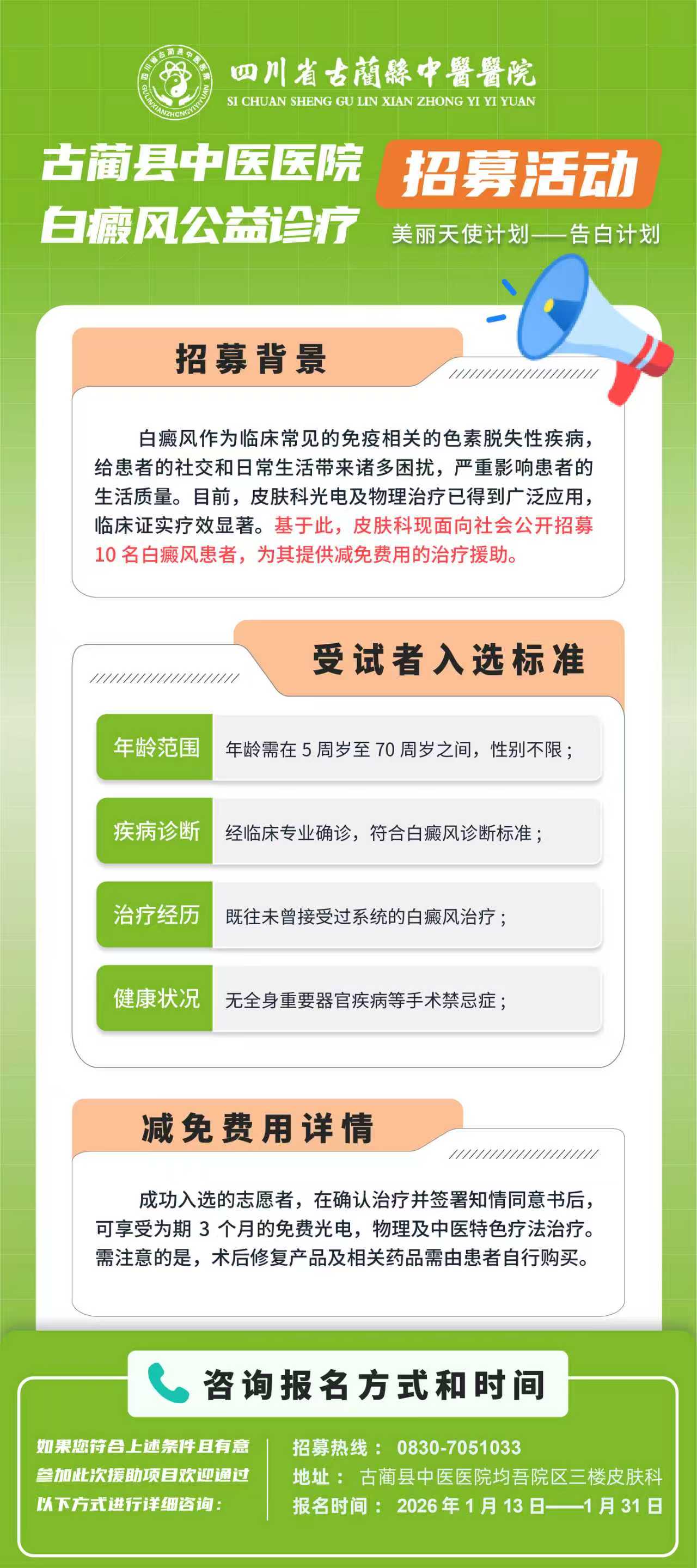 为帮助更多患者摆脱疾病困扰,让优质医疗资源惠及民生,古蔺县中医医院皮肤科特发起「美丽天使计划——告白计划」白癜风公益诊疗活动,面向社会公开招募10名患者,提供减免费用的专业治疗援助!