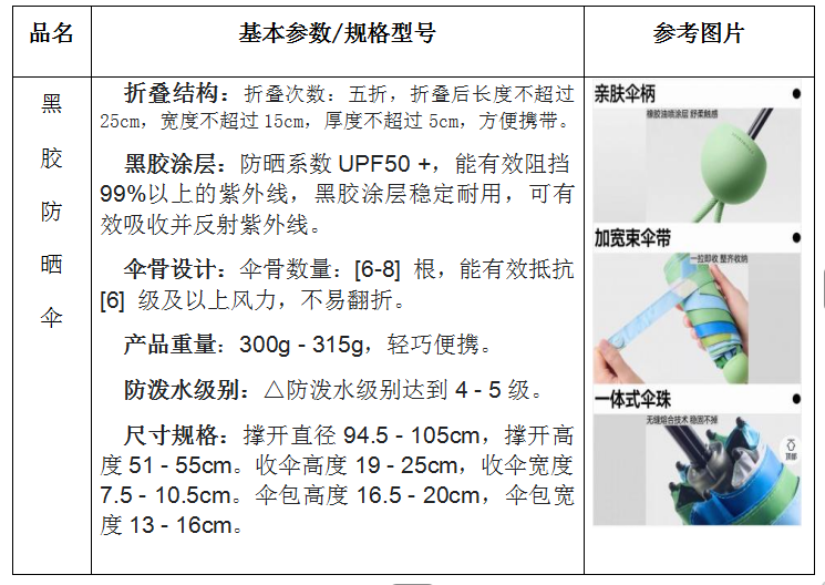 (四)质保期及售后要求:提供6个月以上质保,质保期内出现非人为损坏(伞骨折断、脱落、防晒层严重脱胶等),免费维修或更换。